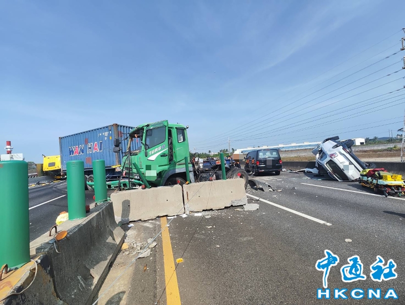 •   11月25日,台灣一輛半聯結車行駛至第一高速公路南向343公里處,為了閃避一輛車,先撞到一輛半聯結車,再撞擊分隔線護欄,衝向北上車道,2部迎面而至的車輛煞車不及撞上失事半連結車,車禍造成13名民眾受傷送醫。 香港中通社圖片