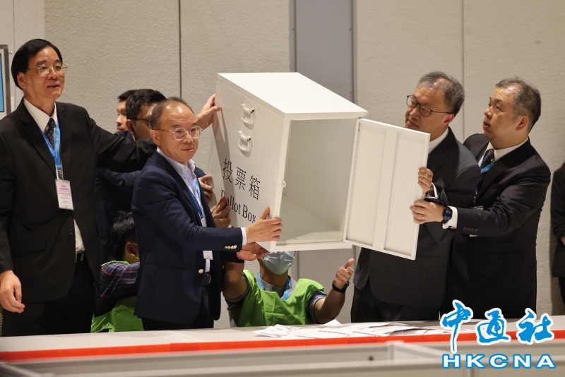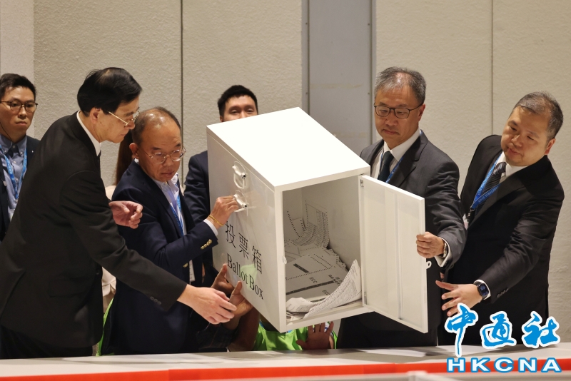 選管會主席陸啟康與政制及內地事務局長曾國衛倒出選票分享到: