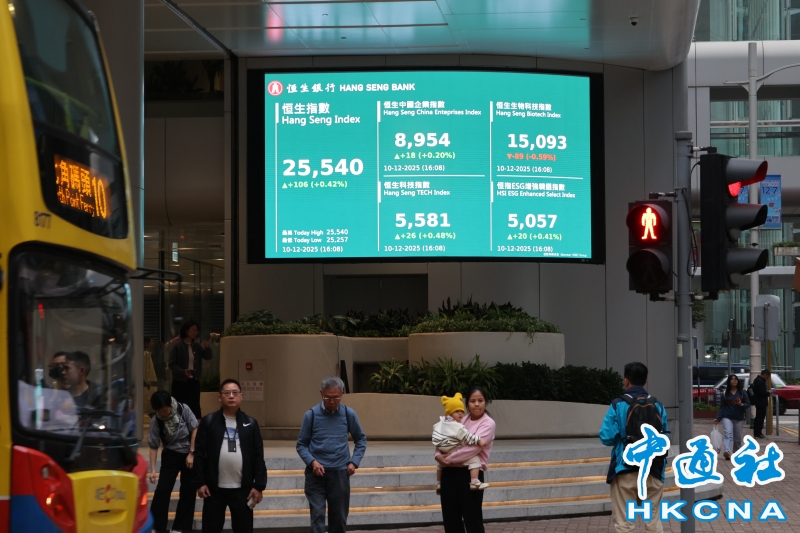 •   12月10日,截至收盤,香港恆生指數漲106.55點,漲幅0.42%,報25540.78點,主板全天成交1933.92億港元。(香港中通社記者 鄧梓傑 攝) 香港中通社圖片