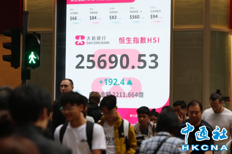 香港恆生指數漲192.40點 報25690.53點收盤