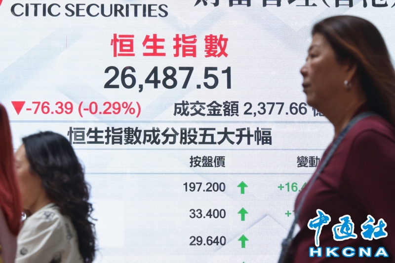 •   1月20日,截至收盤,香港恒生指數跌76.39點,跌幅0.29%,報26487.51點,主板全天成交2377.66億港元。 (香港中通社記者  謝光磊 攝) 香港中通社圖片