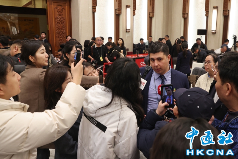 •   3月3日,全國政協十四屆四次會議新聞發布會在人民大會堂一層新聞發布廳舉行,這是全國兩會的首場新聞發布會,備受關注。圖為中阿衛視記者使用中文提問,發布會後成為媒體熱門採訪對象。(香港中通社記者 謝光磊 攝) 香港中通社圖片