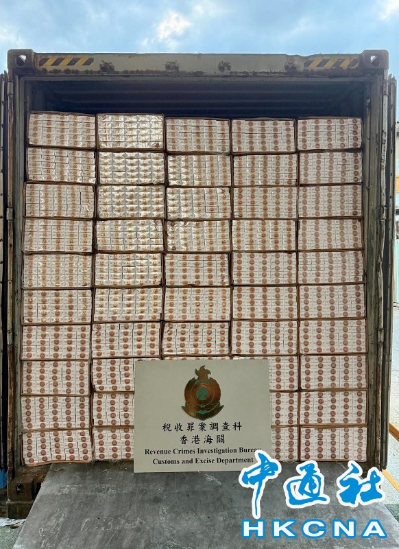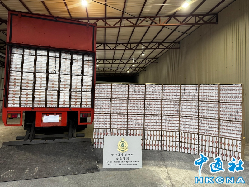 •   香港海關昨日(4月9日)在粉嶺搗破兩個懷疑私煙貯存倉庫,共檢獲超過880萬支懷疑私煙,估計市值共約3970萬港元,應課稅值約2910萬港元,並拘捕一名懷疑涉案男子。圖為於其中一個物流倉庫及中型貨車內檢獲的懷疑私煙。 香港中通社圖片