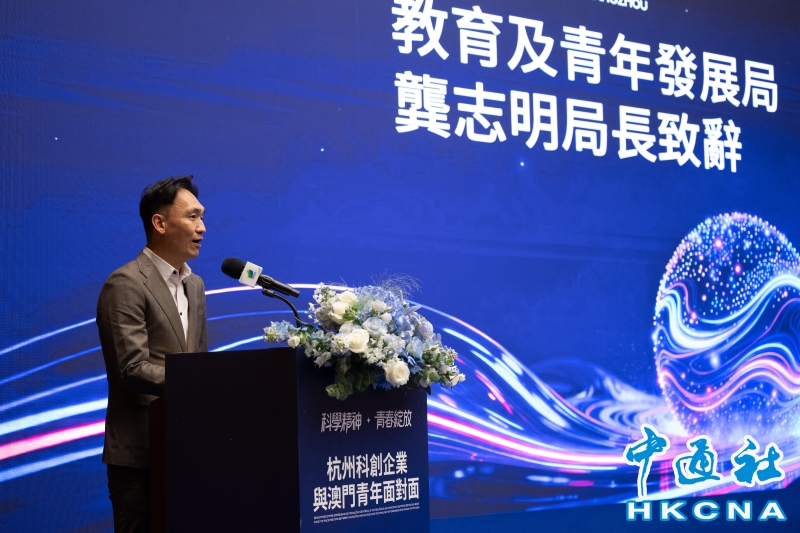 •   4月27日,澳門教青局局長龔志明在活動上發言。當日,澳門教青局邀請杭州多間優秀科創企業來澳與澳門青年分享創業經驗、科技發展趨勢,拓寬澳門青年科技視野,約 300多名本澳青年學生出席,社會文化司司長柯嵐、澳門中聯辦副主任呂玉印等出席活動開幕式。 香港中通社圖片