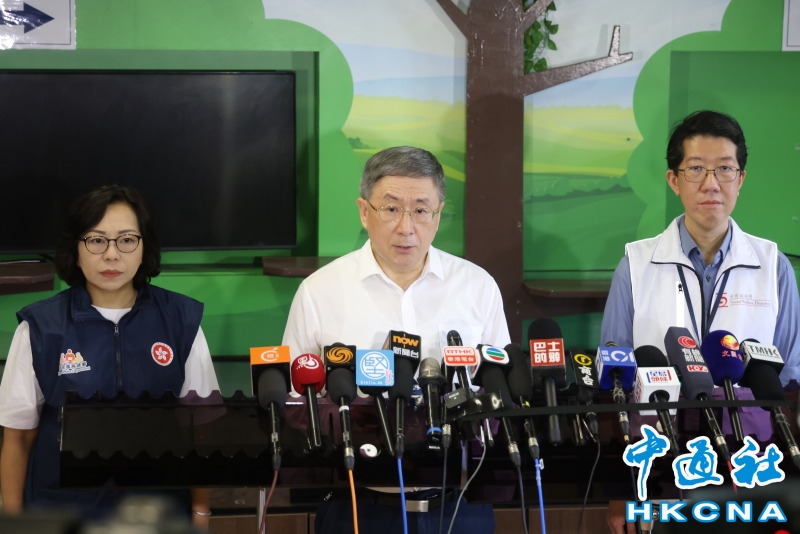 •   4月29日,香港政府有關部門安排大埔宏福苑受災居民第三輪分批返回單位執拾。圖為政務司副司長卓永興(中)和民政及青年事務局局長麥美娟(左)早上視察情況後,在大埔浸信會公立學校會見傳媒。 香港中通社圖片