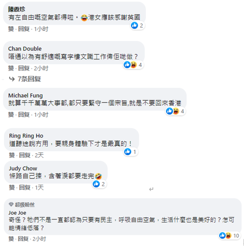 眼見劉珈汶等“黃絲”抵英後不僅沒獲得所謂的“民主”,更被英國現況整得“叫苦不迭”! 不少香港網友揶揄:“奇怪?他們不是一直認為只要有‘民主’,呼吸‘自由’空氣,生活就是美好的?怎可能情緒低落?”“有‘自由’的空氣就行啦”“(曾經)生在福中不知福,(如今)淪落他鄉慢慢受......” “這條路自己選的,含著淚都要走完!”還有網友諷刺道。