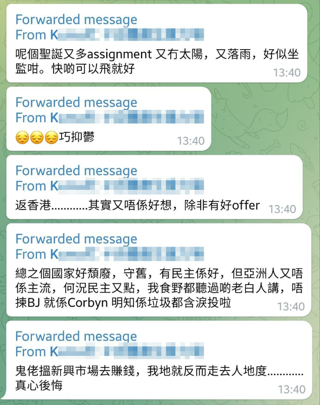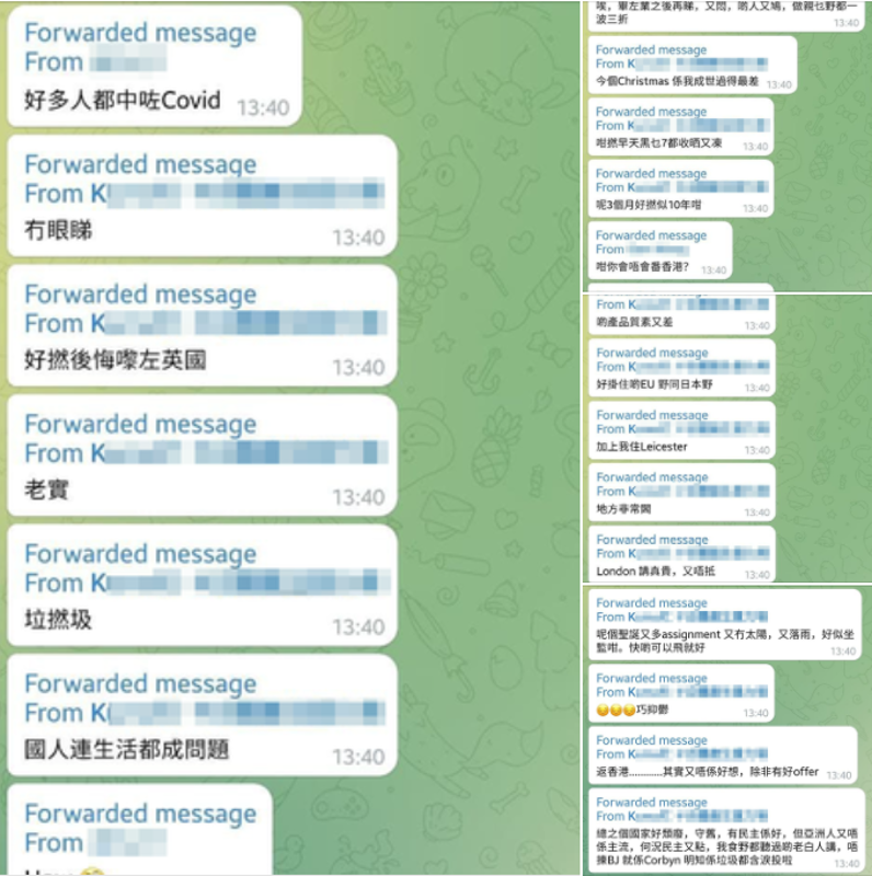 “好多人都中了新冠病毒!”在截圖中,一名移英港人直言“好後悔來到英國”,吐槽“倫敦物價高”,以及在英國度過的聖誕節是歷年來“過得最糟糕的,沒太陽又下雨,好像坐牢”。 以往備受移英港人推崇的“西方民主”,此刻亦仿佛失去了“光環”! 該移英港人抱怨:“雖然英國有‘民主’,但亞洲人(在英國)不是主流,更何況有民主又怎樣,有白人就說在英國不是投約翰遜(英國首相),就是投科爾賓(英國政客),明知他們做得不好都要含淚投......” “英國人都去新興市場賺錢了,反而我們卻來到英國,真心後悔!”該移英港人大發牢騷道。