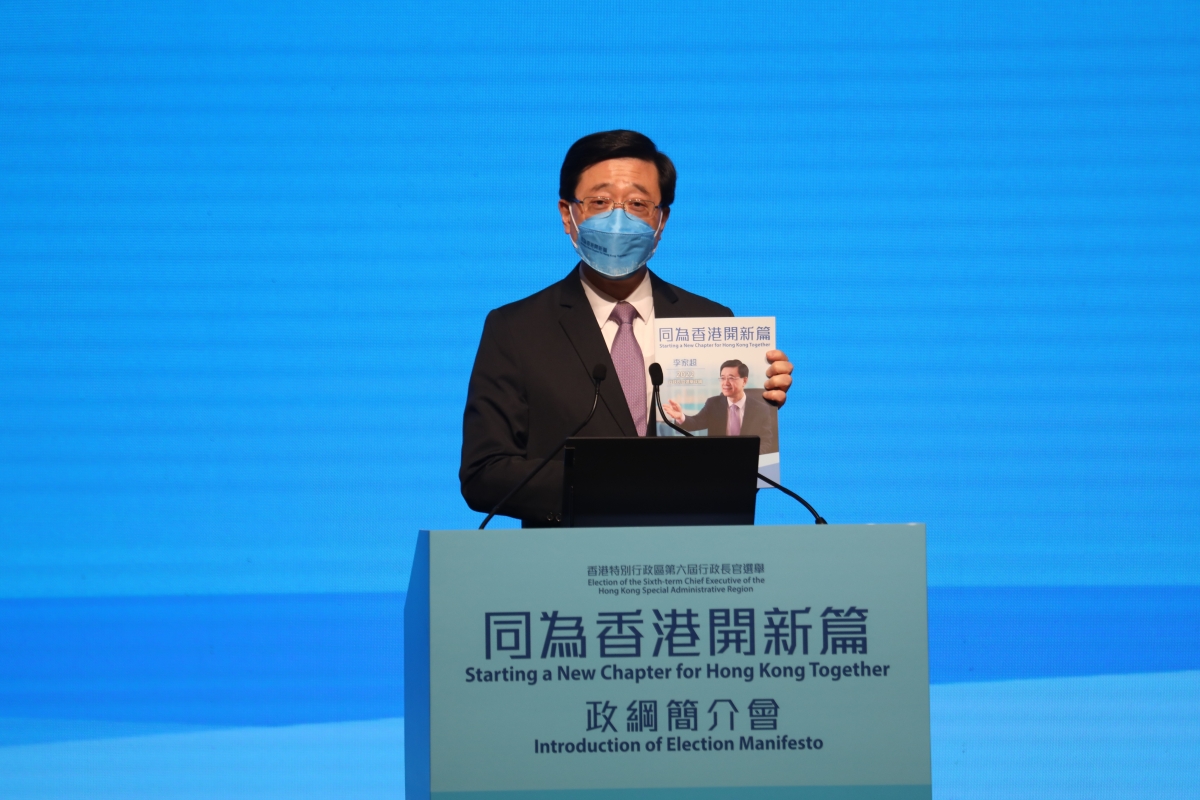 李家超說,4大綱領中分別為強化政府治理能力、土地和房屋供應上提速提效提量、提升香港競爭力強調持續發展、建立關愛社會重視青年發展。(記者 崔靜雯)