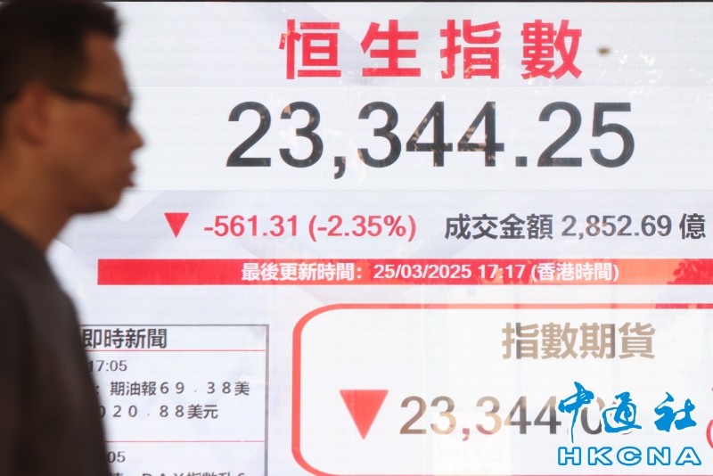 香港中通社3月25日電(記者 譚暢)港股25日錄得逾500點跌幅,恒生指數收市跌561點或2.4%,報23344點。大市全日成交約2852.7億港元。