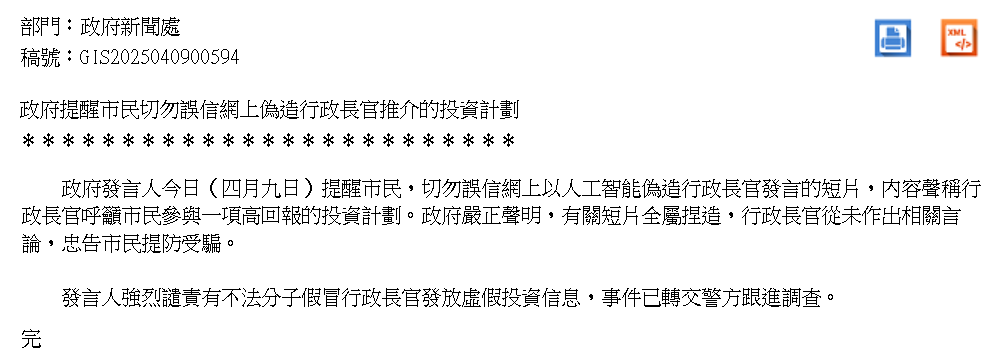 網上偽造行政長官推介投資計劃 特區政府提醒市民切勿誤信