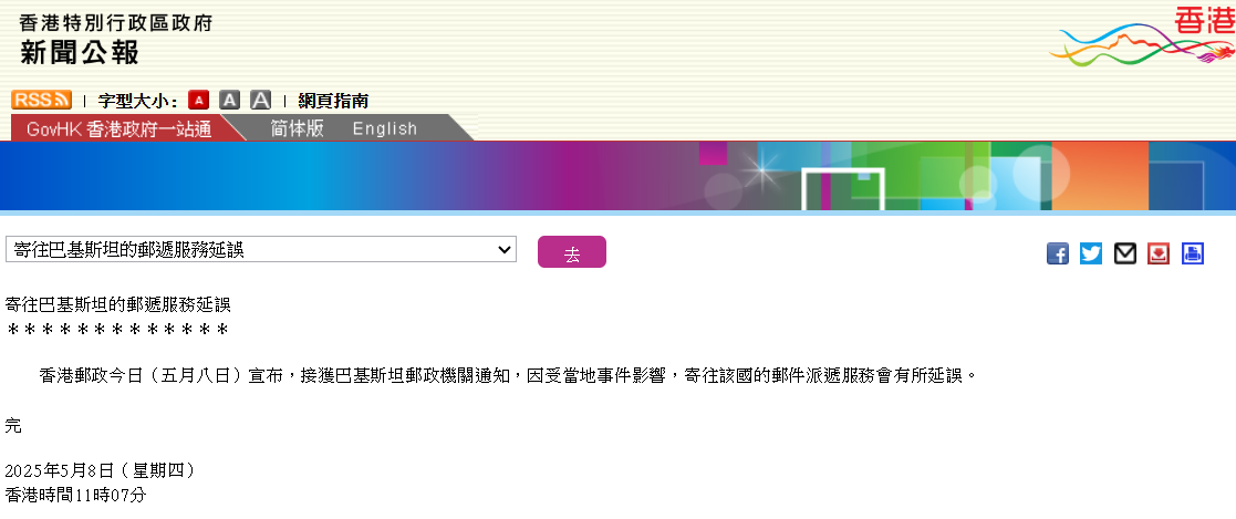 受印巴衝突影響 香港寄往巴基斯坦郵遞服務延誤