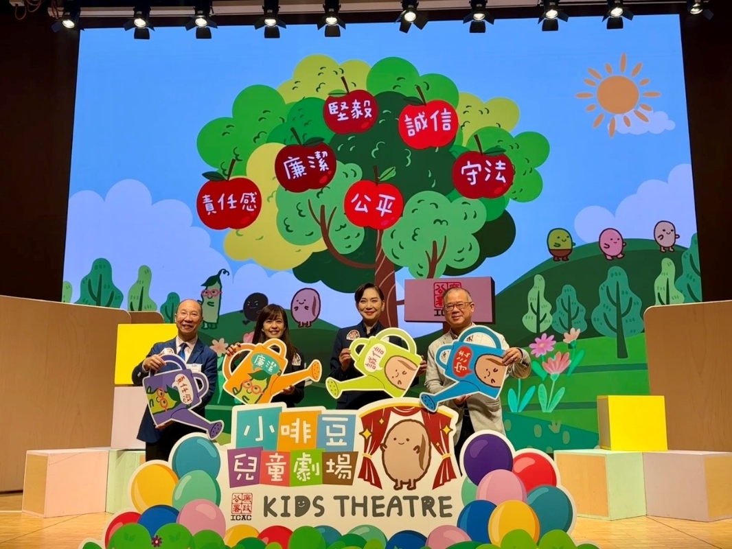 開show儀式。圖源:廉政公署 響應今天“國際兒童節”,廉署於總部特別加開兩場“小啡豆兒童劇場”回饋支持小啡豆的小朋友,透過互動戲偶話劇《誠實大作戰》,以輕鬆有趣方式向小朋友灌輸正確價值觀,吸引近400位幼稚園學童及家長參與。