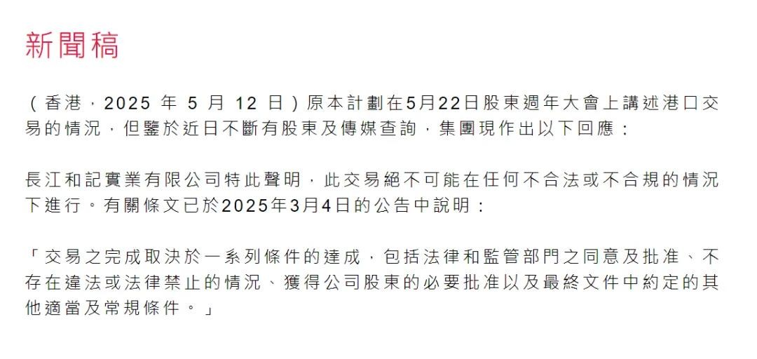 長江和記實業有限公司特此聲明,此交易絕不可能在任何不合法或不合規的情況下進行。有關條文已於2025年3月4日的公告中說明:“交易之完成取決於一系列條件的達成,包括法律和監管部門之同意及批准、不存在違法或法律禁止的情況、獲得公司股東的必要批准以及最終文件中約定的其他適當及常規條件。” (完) 【編輯:錢林霞】