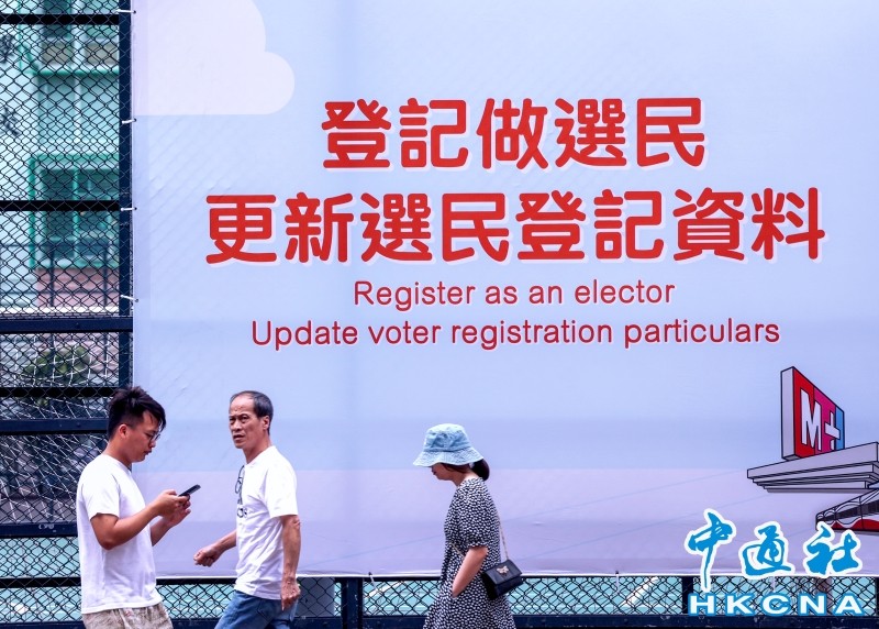 圖為深水埗提醒市民登記及更新資料的大型廣告標語。香港中通社圖片 【編輯:彭玉婷】