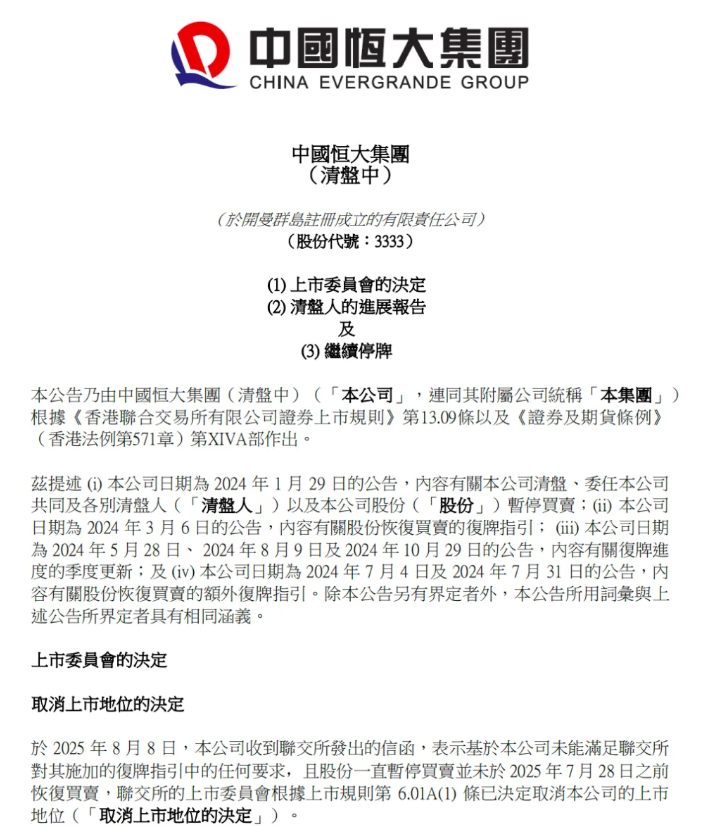 股份最後上市日期為2025年8月22日,並將於2025年8月25日上午九時起取消股份上市地位。中國恒大在公告中表示,公司無意就上市委員會作出取消上市地位的決定申請覆核。 對股東、投資者及潛在投資者的影響方面,公告指出,公司所有股東、投資者及潛在投資者應注意,於最後上市日期後,盡管股份的股票仍然有效,但股份將不會在聯交所上市及不可於聯交所買賣。此後,公司將不再受上市規則規管。 對於清盤進展情況,在中國恒大取消上市地位前,清盤人擬向公司的持有者提供一份報告,概述公司在2024年1月29日至2025年7月31日期間的清盤進度。 曾經的“地產巨擘”中國恆大集團總部位於廣東深圳,是中國大型地產發展商之一,其前身由許家印於1996年在廣州創立。2016年,集團進入《財富》世界500強,後於2021年陷入債務危機。(完) 【編輯:譚暢】