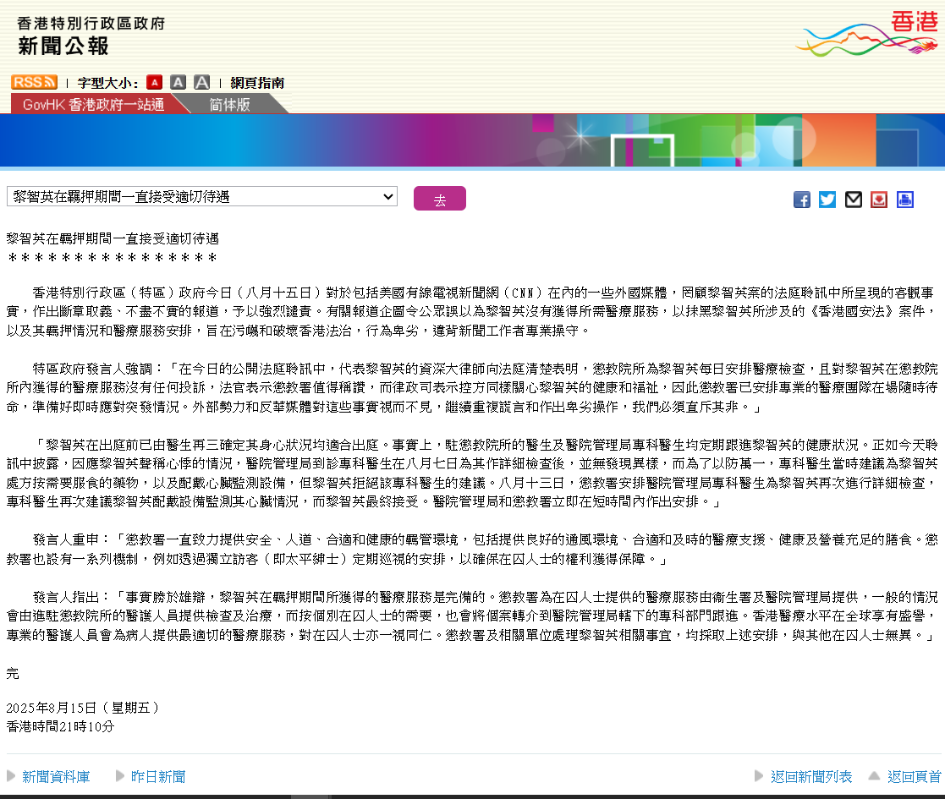 香港新聞網8月15日電 香港特區政府15日對於包括美國有線電視新聞網(CNN)在內的一些外國媒體,罔顧黎智英案的法庭聆訊中所呈現的客觀事實,作出斷章取義、不盡不實的報道,予以強烈譴責。有關報道企圖令公眾誤以為黎智英沒有獲得所需醫療服務,以抹黑黎智英所涉及的香港國安法案件,以及其羈押情況和醫療服務安排,旨在污衊和破壞香港法治,行為卑劣,違背新聞工作者專業操守。