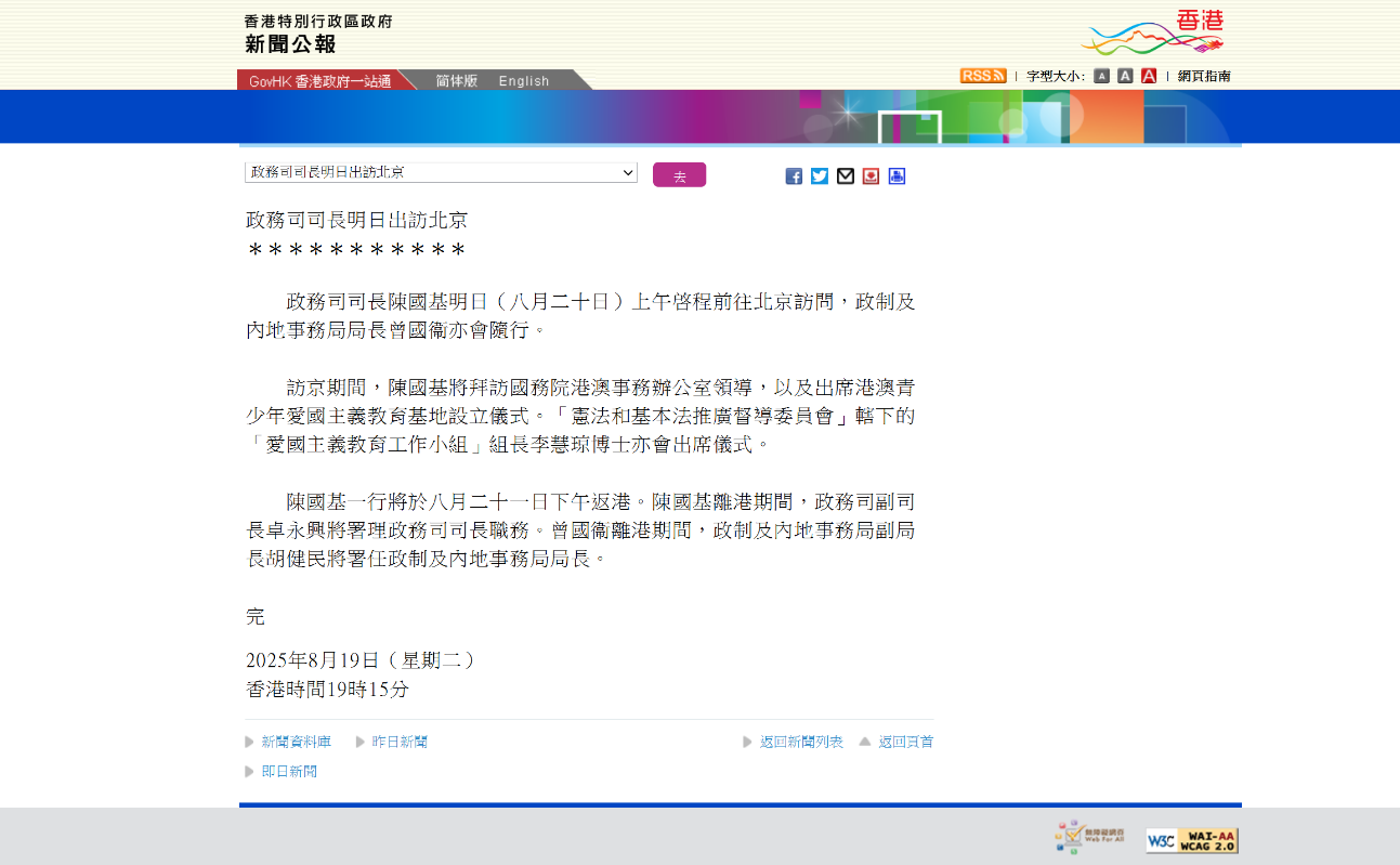 香港新聞網8月19日電 香港特區政府政務司司長陳國基8月20日上午將啓程前往北京訪問,政制及內地事務局局長曾國衞亦會隨行。