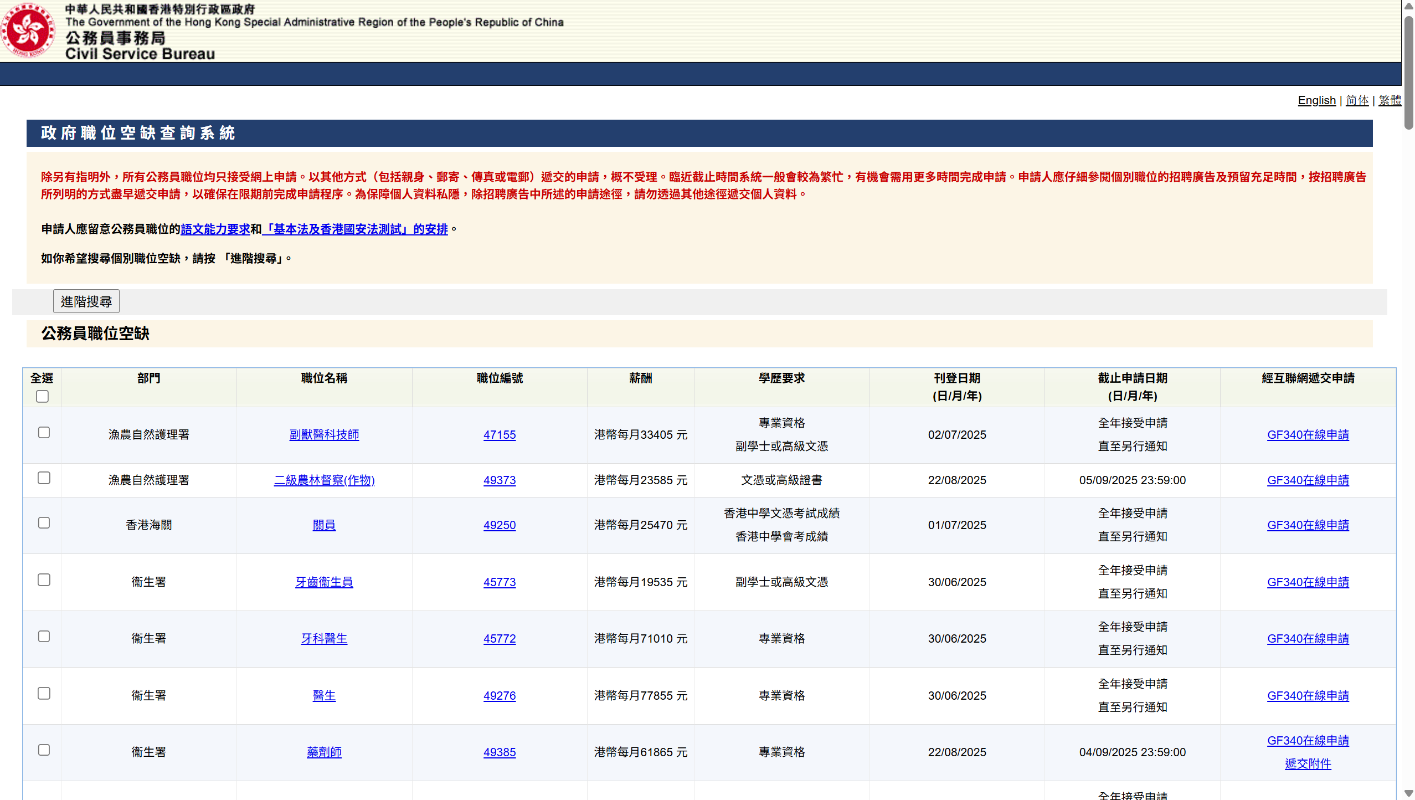 公務員事務局網站截圖 其中,公務員職位空缺包括漁農自然護理署的二級農林督察(作物)、衞生署的藥劑師,以及律政司政府律師 此外,非公務員職位空缺包括教育局的課程主任(幼稚園及小學/小學)和課程主任(德育、公民及國民教育) 、投資推廣署的高級副總裁(金融服務)、終審法院首席法官官邸的合約廚師、康樂及文化事務署的薩克管和雙簧管兼職導師職位,以及規劃署的建築設計主任。 其中,律政司政府律師公開招聘的申請人數大幅上升,由2022年的277人、2023年的330人,增至2024年的444人,增幅高達六成。律政司司長林定國表示,成為政府律師,將有機會投身刑事訟辯、民事訴訟、提供法律意見、草擬雙語法例、商業法、司法互助,以及法律政策的制定與推行等多元而具挑戰性的領域。在律政司工作,將與決策局、政府部門及執法機關緊密合作,參與對全港市民有深遠影響的法律決策與過程,這些機會是私人執業所難以提供的。(完) 【編輯:梁嘉軒】
