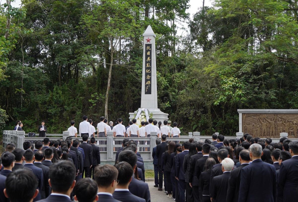 在莊嚴肅穆的氣氛中,全體人員集體肅立默哀,向抗日先烈敬獻鮮花、行鞠躬禮,并依次瞻仰紀念碑。