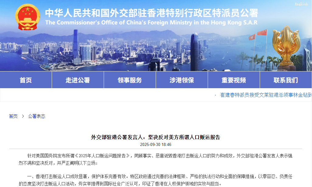 圖片來源:外交部駐港公署官網 發言人表示,香港打擊販運人口成效顯著,保護體系完善有效。特區政府通過完善的法律框架、嚴格的執法行動和全面的保障措施,以零容忍、負責任的態度堅決打擊販運人口活動,務實舉措得到國際社會廣泛認可,印證了香港在人權保護領域的實效與擔當。 發言人認為有關報告毫無公信力,不過是服務政治操弄的工具。美國年復一年炮製所謂人口販運報告,自我美化標榜為"一類國家",忽視自身存在嚴重的人口販運問題,卻以“教師爺”口吻對他國指手畫腳,充分暴露其自欺欺人的雙重標準。美方報告還借所謂販運人口抹黑香港國安法和國安條例,有關內容違背事實、充滿偏見,是對香港法治和人權狀況的惡意污蔑。 香港由治及興大勢所趨,發展前景不容詆毀。發言人強調,香港法治指數位居世界前列,國際金融中心地位更加穩固,營商環境持續優化,任何外部干預和污蔑抹黑都動搖不了香港繁榮穩定的堅實基礎,阻擋不了"一國兩制"行穩致遠的發展進程,阻擋不了香港融入國家發展大局的歷史大勢。敦促美方反躬自省,立即停止以"人權衛士"自居的雙標行徑,立即停止以各種藉口干預香港事務的政治操弄。(完) 【編輯:馬華】