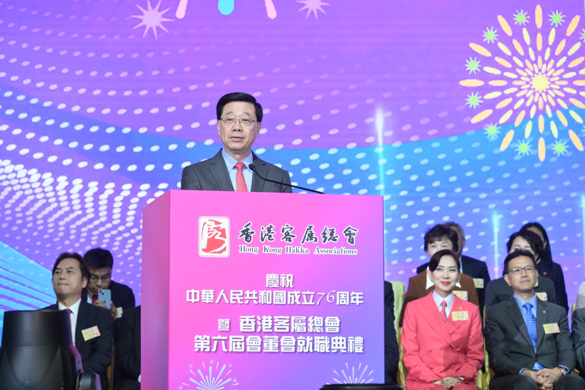 香港特區行政長官出席慶祝中華人民共和國成立76周年暨香港客屬總會第六屆會董會就職典禮致辭。圖源:行政長官辦公室