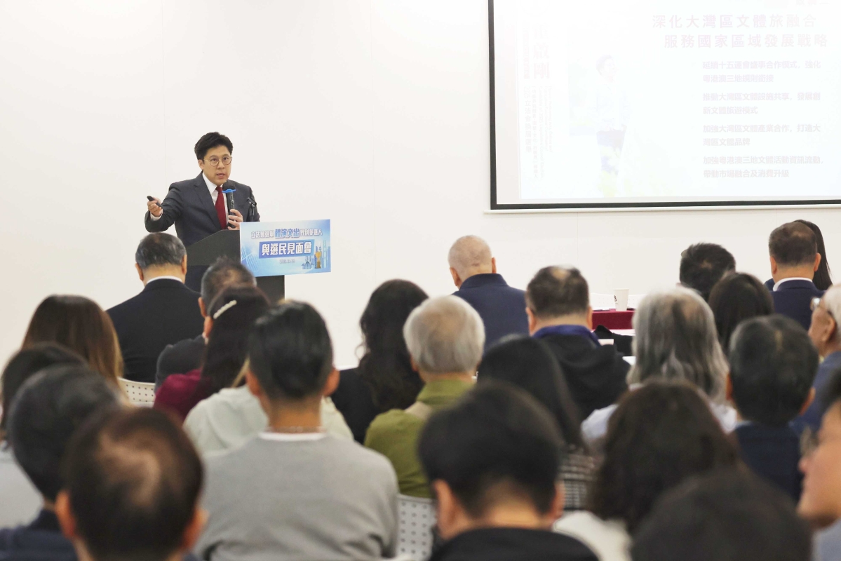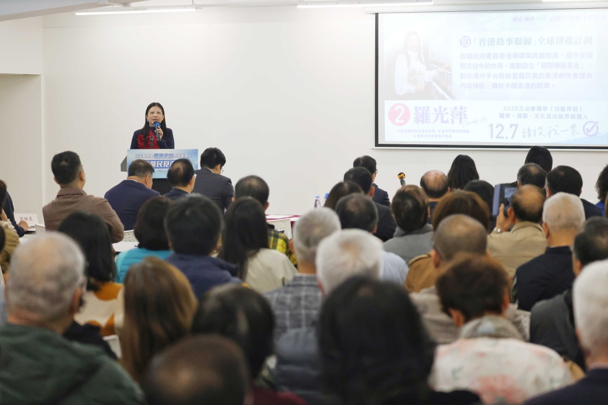 (香港中通社圖片 謝光磊攝) 本屆選舉競爭多元激烈,161名候選人角逐90個席位。候選人之間展開公正、公平、公開的良性競爭,向選民具體闡明其政策主張以爭取支持。2025年立法會換屆選舉體演文出界別由霍啟剛和羅光萍兩名候選人,競爭一個席位。見面會上,兩位候選人分別介紹參選初衷和政綱理念,並就業界重要議題各抒己見。 霍啟剛講解參選政綱時,強調以文化體育為載體,深化國際交往合作,並進一步推動大灣區文體旅融合,服務國家區域發展戰略。他指出,香港具備融通中外的獨特平台優勢,應積極引入並主辦更多國際級文體盛事,同時助力國家賽事品牌走向世界。他還强調,應借助影視行業作為文化輸出的重要渠道,協助推廣作品出海,並吸引海外攝製團隊來港拍攝,提升中華文化的國際影響力。此外,霍啟剛也聚焦於大灣區發展,提出延續“十五運會”的成功合作經驗,推動粵港澳三地在規則銜接、設施共享、產業協同等方面的深度融合。他建議加強大灣區文體活動資訊流通,帶動市場融合與消費升級,共同打造具影響力的區域文體品牌。