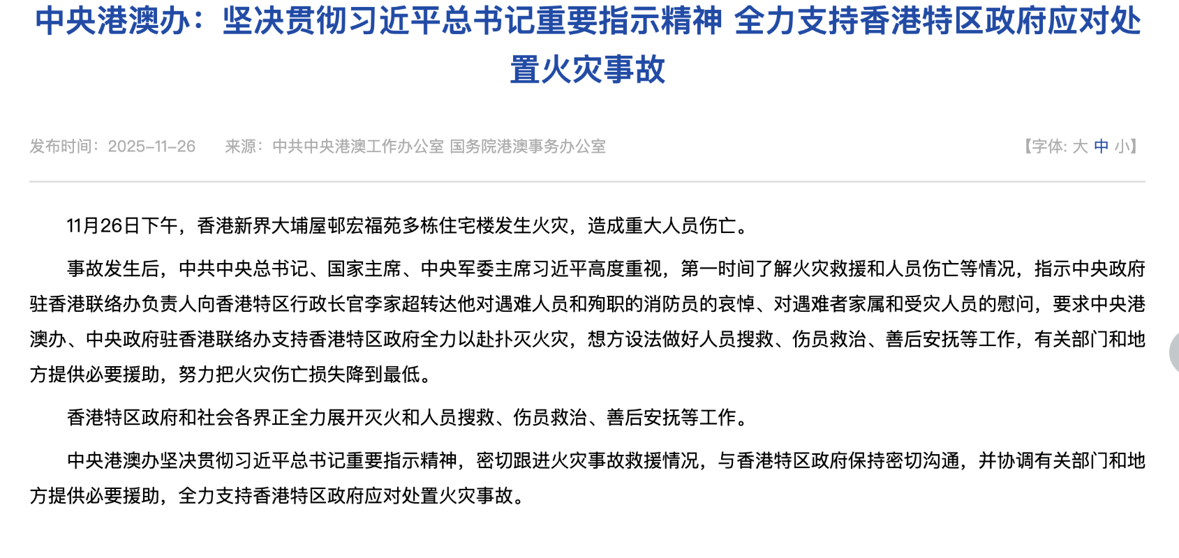 事故發生後,中共中央總書記、國家主席、中央軍委主席習近平高度重視,第一時間了解火災救援和人員傷亡等情況,指示中央政府駐香港聯絡辦負責人向香港特區行政長官李家超轉達他對遇難人員和殉職的消防員的哀悼、對遇難者家屬和受災人員的慰問,要求中央港澳辦、中央政府駐香港聯絡辦支持香港特區政府全力以赴撲滅火災,想方設法做好人員搜救、傷員救治、善後安撫等工作,有關部門和地方提供必要援助,努力把火災傷亡損失降到最低。 香港特區政府和社會各界正全力展開滅火和人員搜救、傷員救治、善後安撫等工作。 中央港澳辦堅決貫徹習近平總書記重要指示精神,密切跟進火災事故救援情況,與香港特區政府保持密切溝通,并協調有關部門和地方提供必要援助,全力支持香港特區政府應對處置火災事故。(完) 【編輯:陳卓儀】