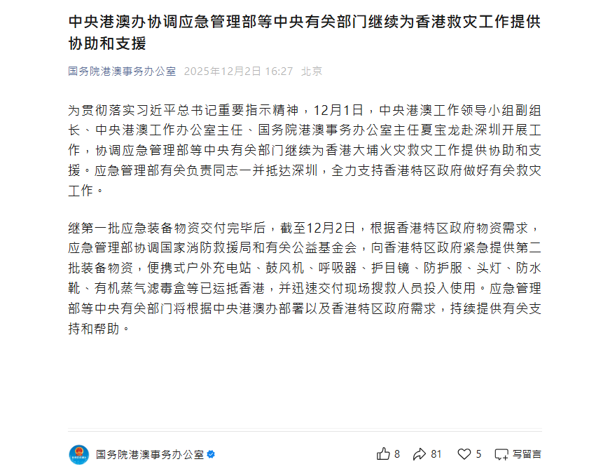 繼第一批應急裝備物資交付完畢後,截至12月2日,根據香港特區政府物資需求,應急管理部協調國家消防救援局和有關公益基金會,向香港特區政府緊急提供第二批裝備物資,便攜式戶外充電站、鼓風機、呼吸器、護目鏡、防護服、頭燈、防水靴、有機蒸氣濾毒盒等已運抵香港,并迅速交付現場搜救人員投入使用。應急管理部等中央有關部門將根據中央港澳辦部署以及香港特區政府需求,持續提供有關支持和幫助。 (完) 【編輯:譚暢】