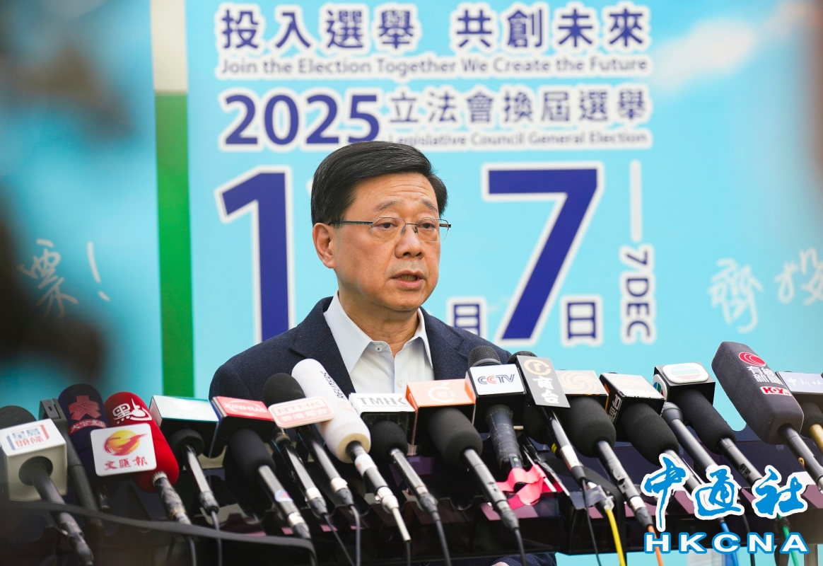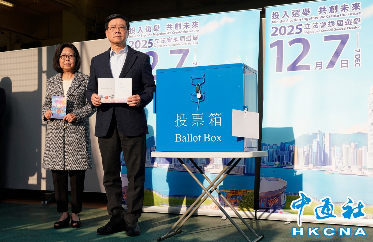 香港新聞網12月7日電(記者 張明臻)2025年香港立法會換屆選舉12月7日舉行,特區行政長官李家超攜太太當日早上在港島高主教書院投票。他投票後見記者時呼籲市民投出推動改革、守護災民的一票。