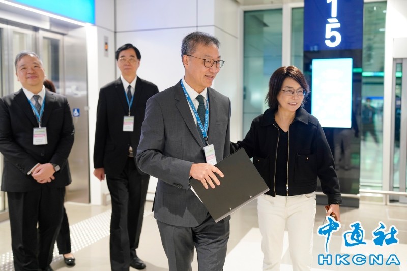 香港選舉管理委員會主席陸啟康法官(右二)巡視設於香港國際機場二號客運大樓旅遊車候車大堂的鄰近邊境投票站。(陳奕啟 攝)