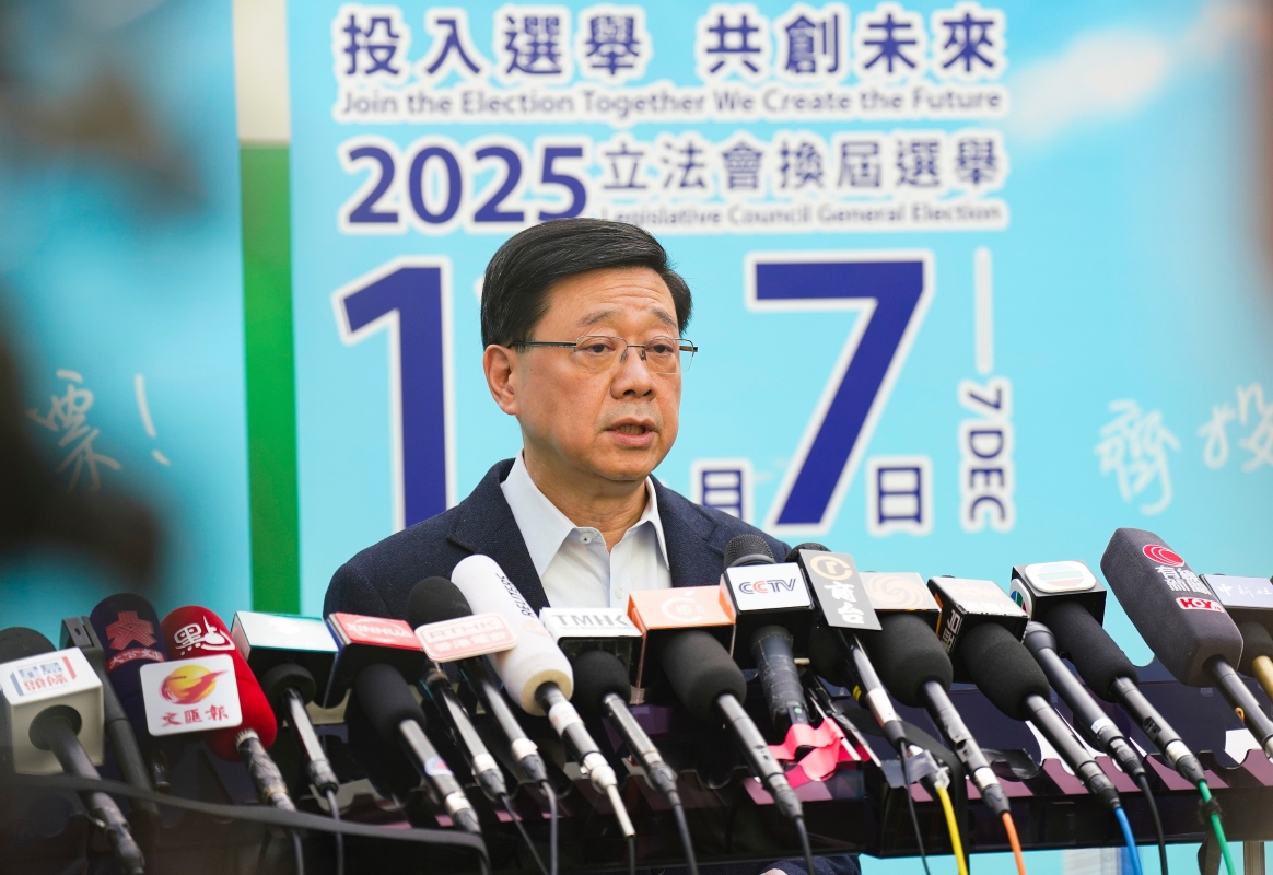 行政長官李家超投票後見記者。 ( 陳奕啟 攝)