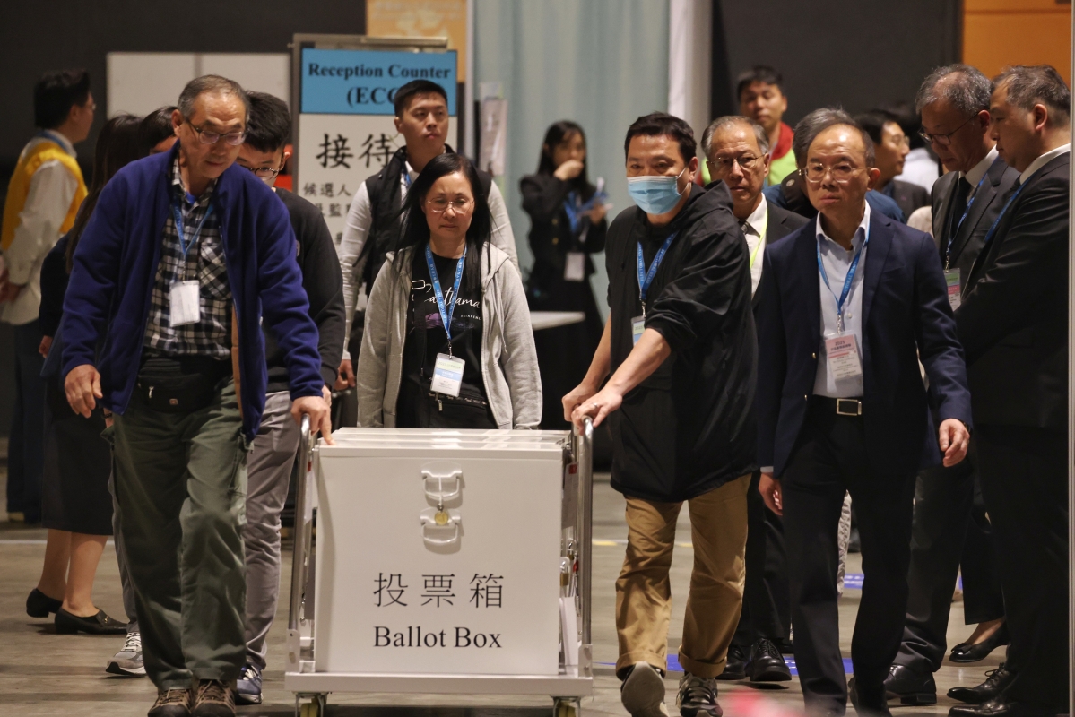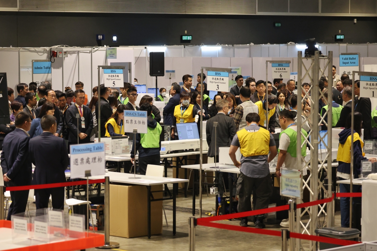 當晚約11時40分,選舉管理委員會主席陸啟康與政制及內地事務局局長曾國衛,在灣仔會展中心中央點票站倒出票箱內的選票。(香港中通社記者 謝光磊 攝)