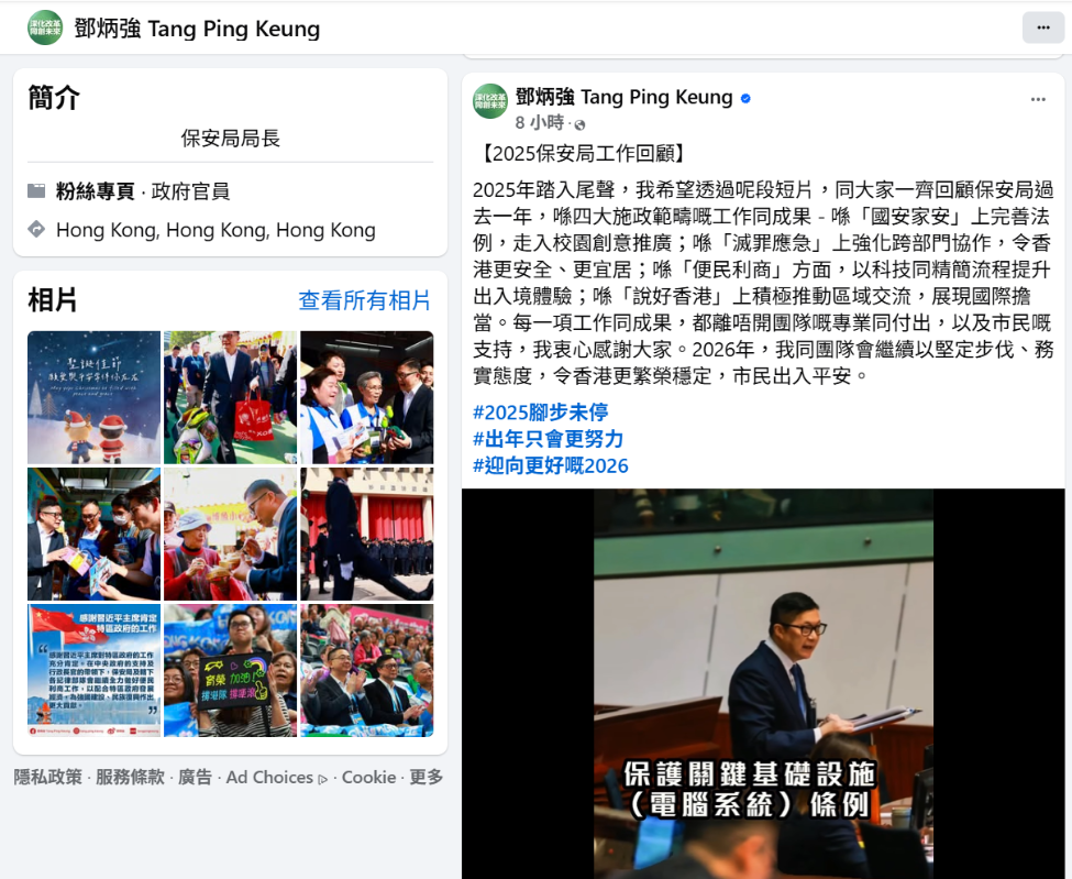 鄧炳強社交媒體截圖 他配文表示:“2025 年即將步入尾聲,我希望藉由這段短片,與大家一同回顧保安局過去一年在四大施政範疇的工作與成果:在“國安家安”方面,完善法例,並以創意方式走進校園進行推廣;在“滅罪應急”方面,強化跨部門協作,使香港更加安全、宜居;在“便民利商”方面,運用科技並精簡流程,提升出入境體驗;在“說好香港”方面,積極推動區域交流,展現國際擔當。” 他說:“每一項工作及其成果,都離不開團隊的專業付出以及市民的支持,我衷心感謝大家。2026 年,我與團隊將繼續以堅定的步伐、務實的態度,讓香港更加繁榮穩定,市民出入平安。”(完)(視頻來源:鄧炳強媒體專頁) 【編輯:梁嘉軒】