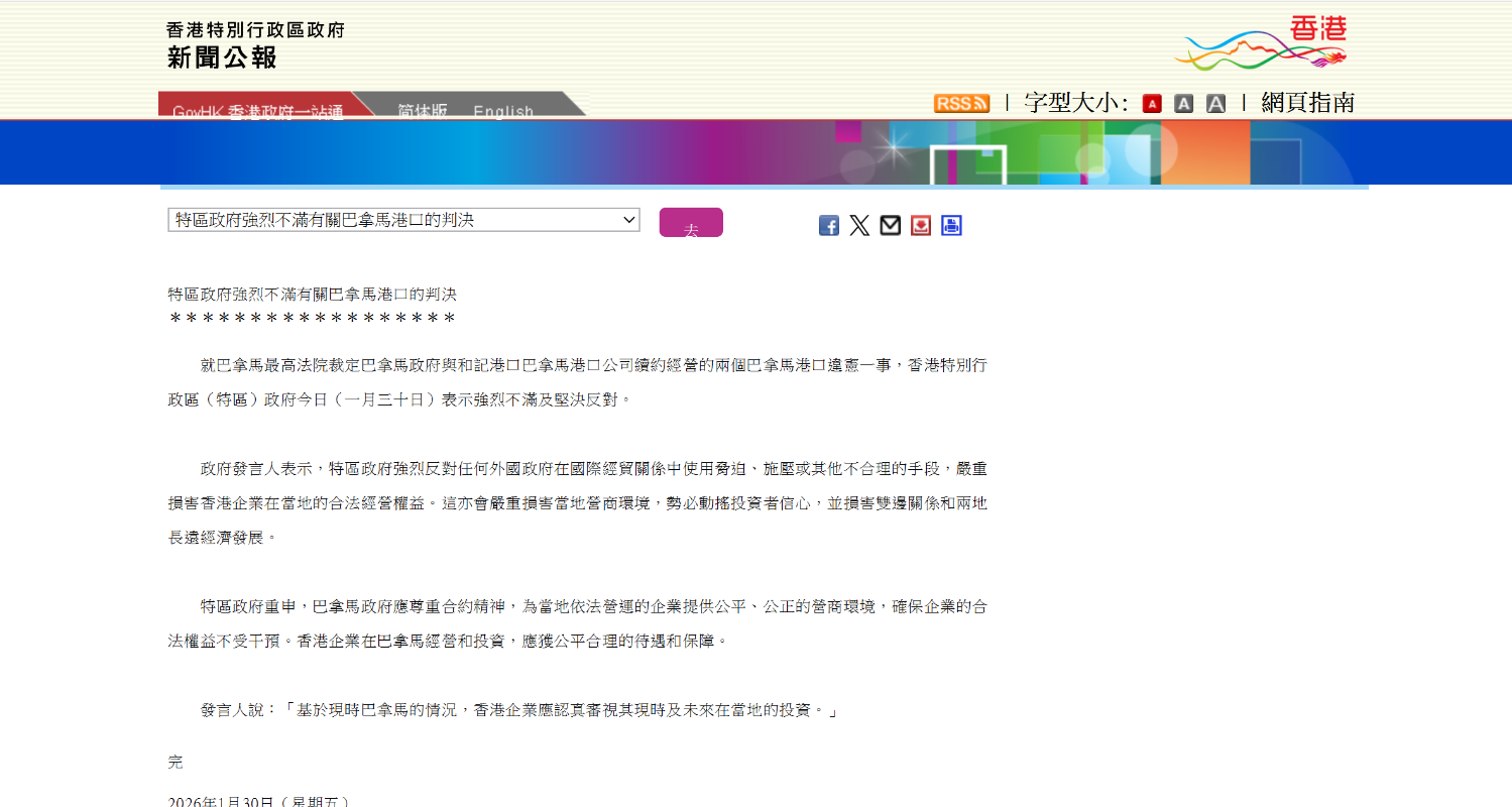香港新聞網1月30日電 就巴拿馬最高法院裁定巴拿馬政府與和記港口巴拿馬港口公司續約經營的兩個巴拿馬港口違憲一事,香港特區政府30日表示強烈不滿及堅決反對。