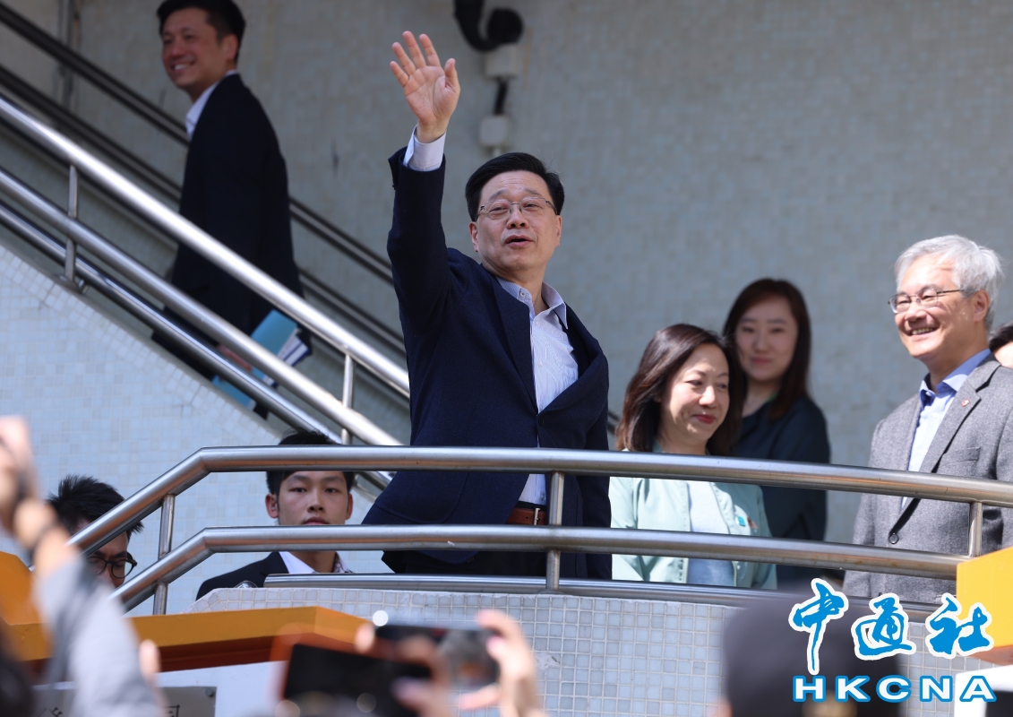 當天上午,李家超抵達油麻地視察,在遊客熱門打卡景點油蔴地警署附近下車,瞬間被人潮圍了裡三層、外三層;現場不止有市民,亦有大批遊客。李家超笑著與大家揮手打招呼:“大家都要馬到功成、一馬當先、事事順利!”他和遊客打趣說“多走走、多看看,多買東西”,引來一片叫好聲。