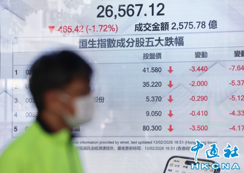 香港中通社2月13日電(記者 張明臻)13日是港股蛇年最後一個交易日,受美股大幅急跌影響,港股明顯受壓。恒指收報26567點,跌465點或1.72%;大市全日成交2575億港元。全周累升7點0.03%。
