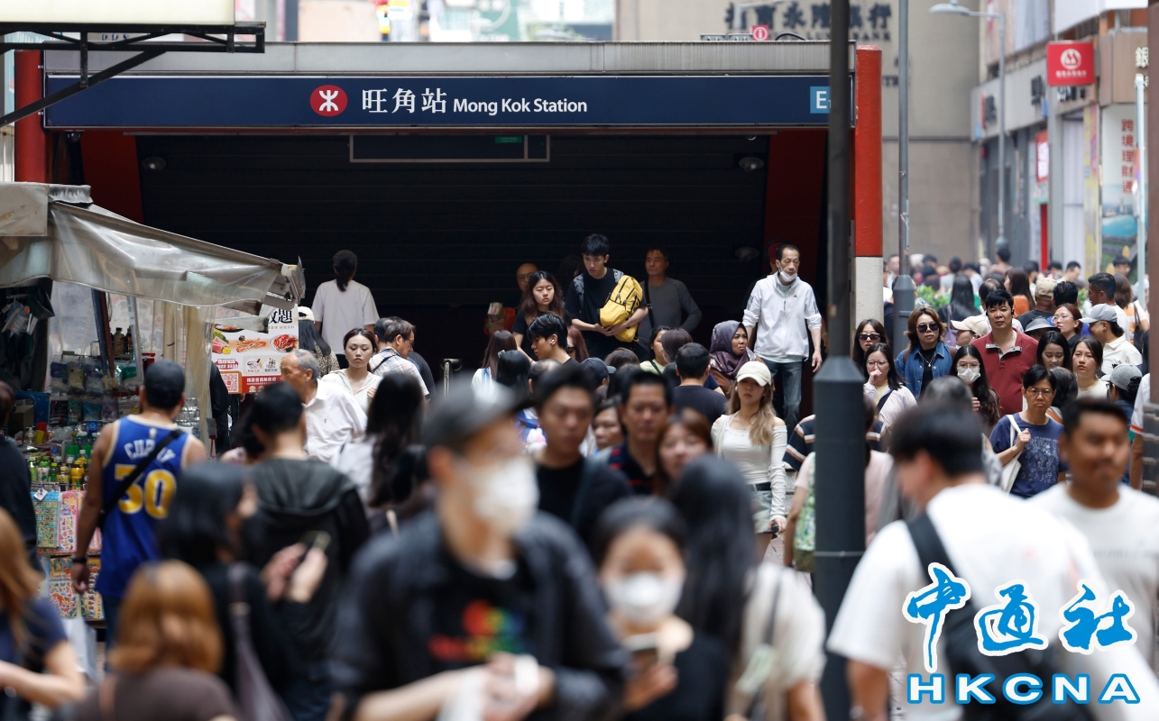 4月6日,眾多旅客趁清明節假期訪港,香港多區人流暢旺。圖為香港旺角地鐵站出口人流如潮。(香港中通社記者 陳奕啟 攝)