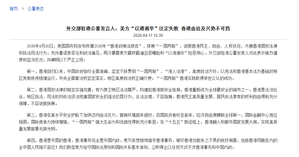 香港新聞網4月17日電 4月16日,美國國務院發佈所謂2026年“香港政策法報告”,抹黑“一國兩制”,詆毀香港民主、自由、人權狀況,污衊香港國安法律和執法司法行為,充斥著謊言謬論和政治偏見,再次暴露美方霸權霸道醜惡嘴臉和“以港遏華”險惡用心。外交部駐港公署發言人對此表示強烈譴責和堅決反對,并闡明以下嚴正立場: 第一,香港回歸以來,中國政府始終全面準確、堅定不移貫徹“一國兩制”、“港人治港”、高度自治方針。以憲法和香港基本法為基礎的特區憲制秩序穩健運行,中央全面管治權堅定落實,特區高度自治權正確行使。“一國兩制”香港實踐取得舉世公認的成功。