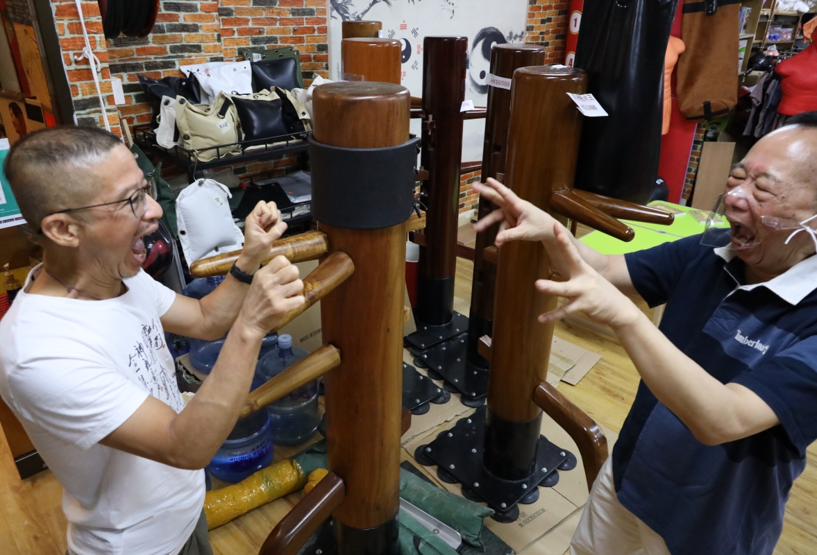 香港新聞網7月23日電(記者洪少葵)7月23日,香港功夫健康會主辦、嘉福康體用品有限公司協辦的一場名為“成語養生法”的講座吸引數十名香港武術健身愛好者到場旁聽。主講嘉賓中國“成語養生法”創始人陶昭強正在演示“張牙舞爪”。