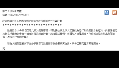 香港特首辦籲提防偽冒李家超訪談的詐騙廣告分享到: