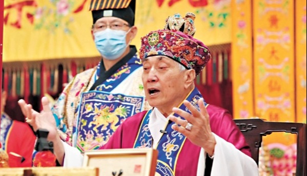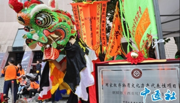 “先點千里眼放光明,順風耳耳聽八方,點鼻辨妖邪,點脷吐千孫,額上發紅光,點背鑼鼓震天庭,點腳踏四方,點身由頭好到尾,國泰民安,風調雨順,大吉大利,百無禁忌,響梆!”麒麟是中國傳統文化中的瑞獸,被人們視為吉祥和祥瑞的象征。2014年,香港西貢坑口客家舞麒麟被列入第四批國家級非遺代表性項目名錄。在西貢下洋村,麒麟紮作的第三代傳承人劉震宇向記者展示麒麟開光的過程。(香港中通社記者 曹文毓攝)