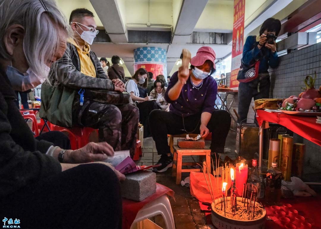 3月5日是中國傳統二十四節氣“驚蟄”,香港灣仔鵝頸橋下聚集了不少街坊市民前來“打小人”,借以驅除厄運趕走“小人”祈求平安。(香港中通社記者 許其皓攝)