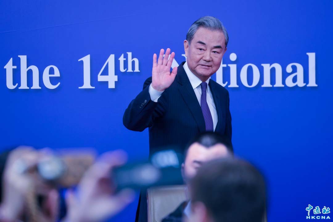 3月7日上午10時,十四屆全國人大三次會議舉行外交主題記者會,邀請中共中央政治局委員、外交部長王毅就“中國外交政策和對外關係”相關問題回答中外記者提問。圖為記者會結束後,王毅向記者揮手致意。(香港中通社記者 謝光磊攝)