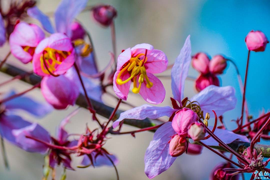 4月9日,香港荔枝角公園盛開的花旗木在春日的照射下引人注目。花旗木,豆科落葉喬木,高可達15米,春季3-4月盛開粉紅總狀花序,下垂如風鈴,花瓣五枚,葉為羽狀複葉,別稱泰國櫻花,原產東南亞,耐旱,熱帶地區廣植為觀賞樹種。(香港中通社記者 許其皓攝)