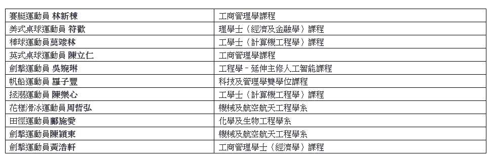 香港新聞網4月24日電 香港科技大學(科大)24日表示,今年透過“學生運動員學習支援及入學計劃”(SALSA)計劃,取錄了超過11名傑出香港運動員,人數創歷年來最高。科大當日舉辦歡迎典禮,特別邀請到一眾傑出學生運動員新生、香港體育學院代表、運動員的教練、中學校長、老師及家人等出席,一同慶祝各精英運動員即將展開人生新一頁,並祝願他們在學業和運動上的發展都能再創高峰。 11名傑出運動員將於今年九月入讀科大,涵蓋桌球、劍擊、賽艇、棒球、花樣滑冰、拯溺、帆船和田徑等項目。名單如圖所示: