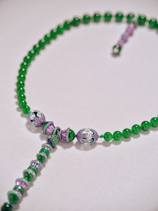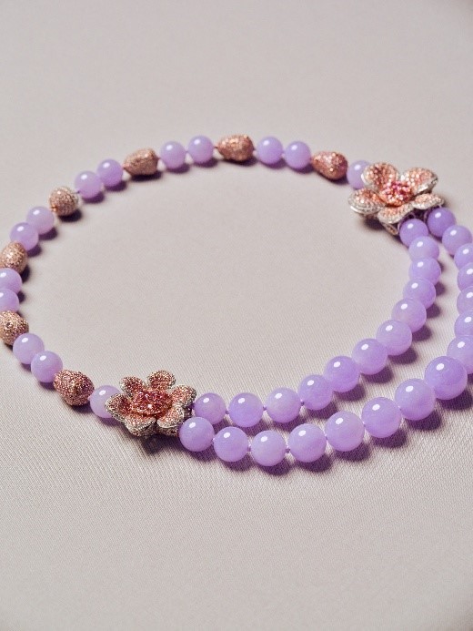 周大福珠寶設計的“阿蓋爾粉紅鑽紫色翡翠項鏈”由共計40.32克拉稀有阿蓋爾粉紅鑽及白鑽製成兩株香港茶花造型,配以 41 顆珍貴紫色翡翠玉珠作為襯托。作品不僅融貫東西方珠寶特色,同時展現香港茶花無懼嚴寒、不屈不撓的品格。