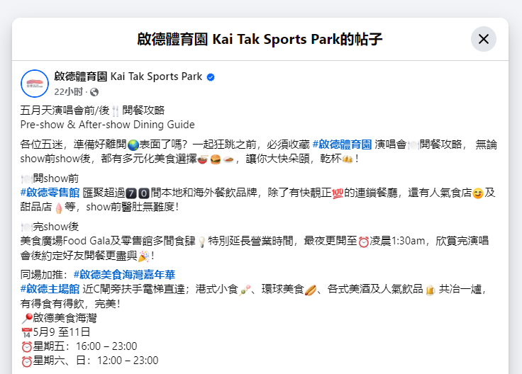 演唱會當日傍晚5時開放入場,晚上7時開SHOW。預計會有較多觀眾將在傍晚下班後車到場。由於正值交通高峰時間,體育園一帶及港鐵屯馬線的交通將會比平日繁忙,考慮到繁忙時段的人流與車流,*觀眾請提前規劃行程*,並預留額外嘅交通時間,*提早到場* 並預留足夠時間進行驗票及安檢,以免影響入場進度。 早嚟有咩著數?為咗照顧廣大“五粉”的肚仔,啟德體育園宣布,所有持票觀眾9日6時前入場,惠顧The Champion餐牌内所有餐飲美食,可以開心享受七五折早鳥優惠! 主場館內多間餐飲設施,提供多款“唯一”喺啟德主場館有賣的炸“洋蔥”、熱狗、漢堡包。演出結束後,如果仍然意猶未盡,啟德零售館裡有13間餐廳以及在美食海灣的市集,提供豐富的宵夜選擇,讓你和朋友們一起繼續派對,享受愉快的夜晚,支持香港盛事經濟! (完) 【編輯:譚暢】