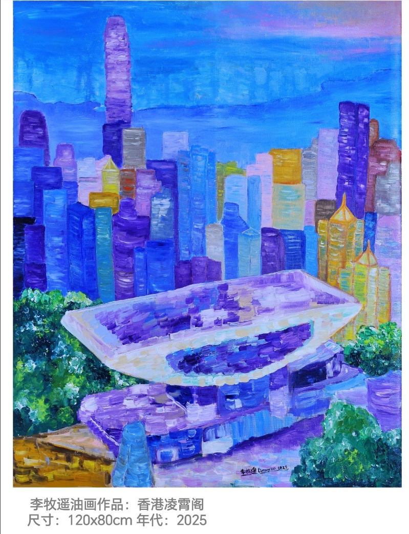 李牧遙油畫作品《香港凌霄閣》,2025年。 蒞臨主禮開幕儀式的重要嘉賓包括:恒通資源集團有限公司董事局主席、中國書法家協會香港分會會長施子清,香江國際集團董事長楊孫西,榮利集團(國際)有限公司董事主席盧文端,香港瓷畫會主席余徐菊霞,裕華國產百貨有限公司董事長余國春,裕華國產百貨有限公司董事總經理余鵬春,裕華國產百貨有限公司董事副總經理李潤基及裕華國產百貨有限公司董事經理陳余小春。