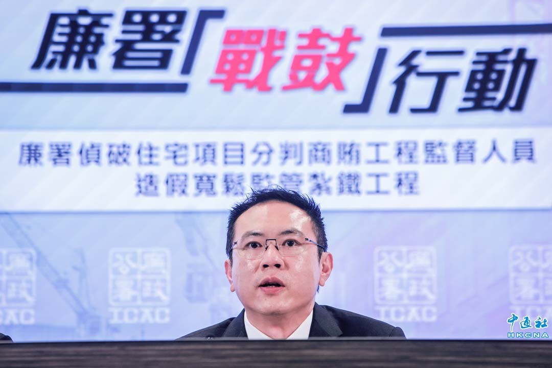 5月21日,香港廉政公署舉行記者會,公佈偵破一宗涉及住宅發展項目建築地盤的貪污造假案,地盤分判商涉嫌行賄工程監督人員換取寬鬆監管鋼筋工程。廉署公佈,上周展開代號“戰鼓”的行動,先後拘捕10名男子,調查發現全部6座樓宇的鋼筋,未按批准圖則興建。圖為香港廉政公署執行處首席調查主任鄭礎明出席記者會。(香港中通社記者 謝光磊攝)