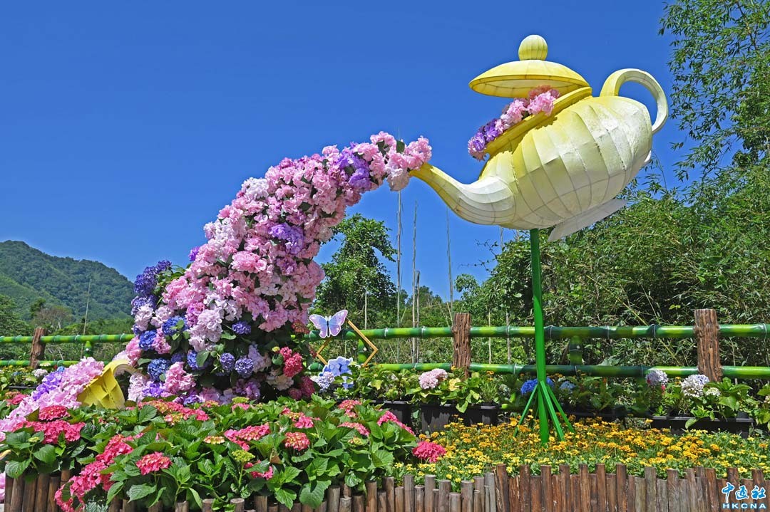 台灣桃園市復興區繡球花魅力商圈及大溪區百吉金針花休閒農業區,沿台7線蜿蜒山道,遇見春夏交織的驚喜,以茶壼為主角繡球花點綴的裝置藝術,巧妙融合在地茶文化與季節花景。 香港中通社圖片